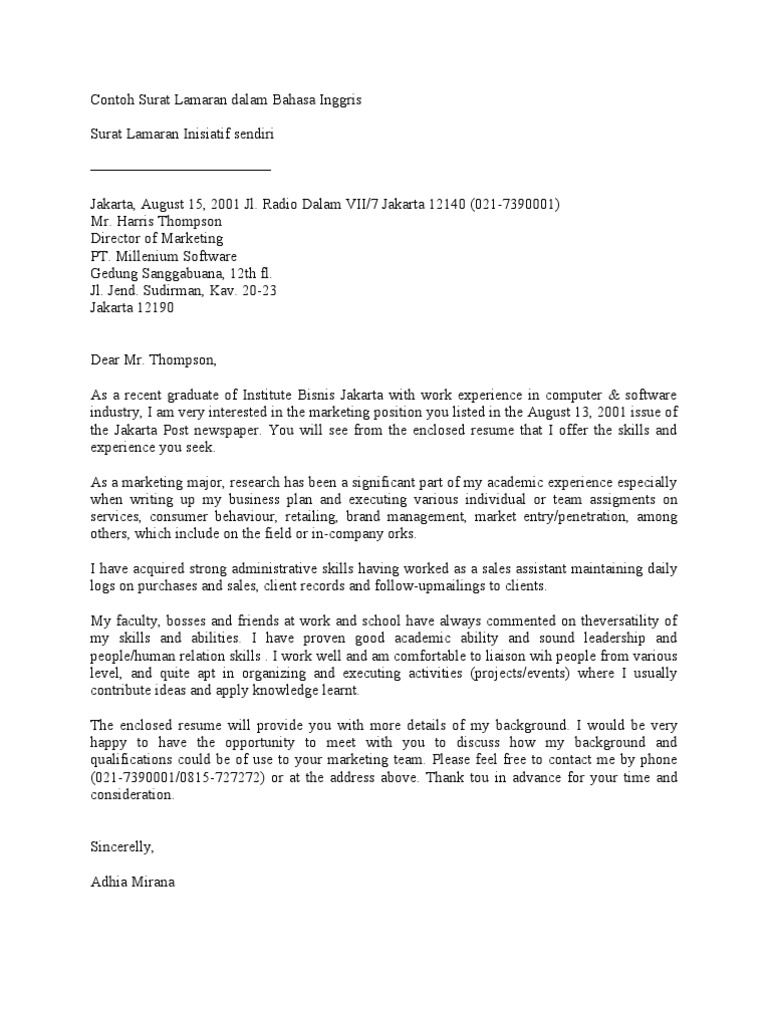 Contoh Surat Lamaran Pekerjaan Dalam Bahasa Inggris from imgv2-2-f.scribdassets.com Sesuaikan dengan jenis lamaran yang akan dikirim. Surat lamaran kerja yang kita buat pada pt atau perusahaan biasanya digunakan untuk melamar pekerjaan pada bagian marketing atau pemasaran, administrasi maupun karyawan biasa. Untuk bekerja sebagai kasir di sebuah indomaret diberikan syarat. Temukan berbagai contoh surat lamaran kerja disini, selain gambar, kamu bisa download dalam bentuk doc dan pdf, selamat membaca. Salah satu syarat yang diwajibkan perusahaan atau pemberi kerja adalah surat lamaran kerja. Sebelum kita lanjut ke contoh surat lamaran, ada baiknya kamu membaca kriteria dan tips untuk membuat surat lamaran kerja yang baik dan benar. Akan tetapi, terkadang kita luput bahwa hal yang esensial bukan hanya soal ketertarikan kita pada pekerjaan yang dilamar tersebut. Surat lamaran kerja merupakan salah satu syarat untuk mendapatkan pekerjaan yang ingin anda dapatkan.